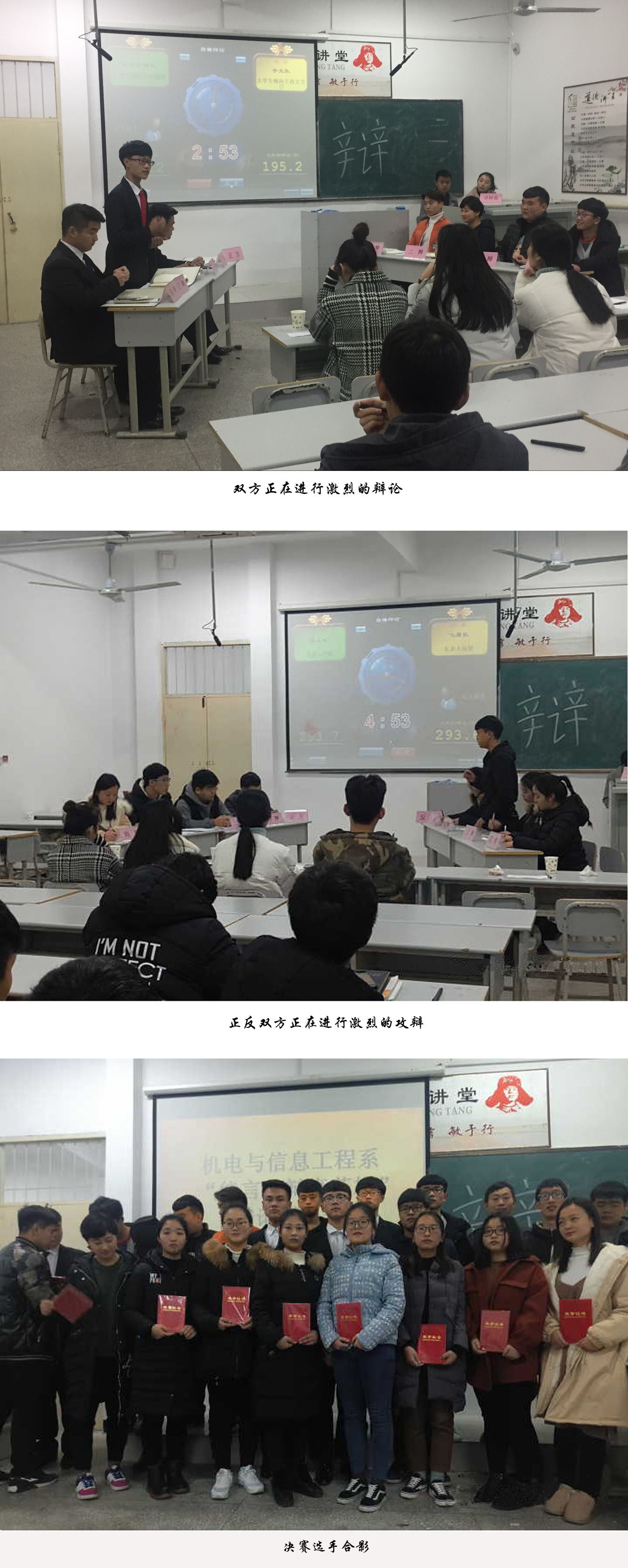 2017年12月20日机电与信息工程系在综合楼408举办了“能言善辩真英雄”辩论赛决赛。系副主任岳学超、学管老师及辩论赛全部选手参加。