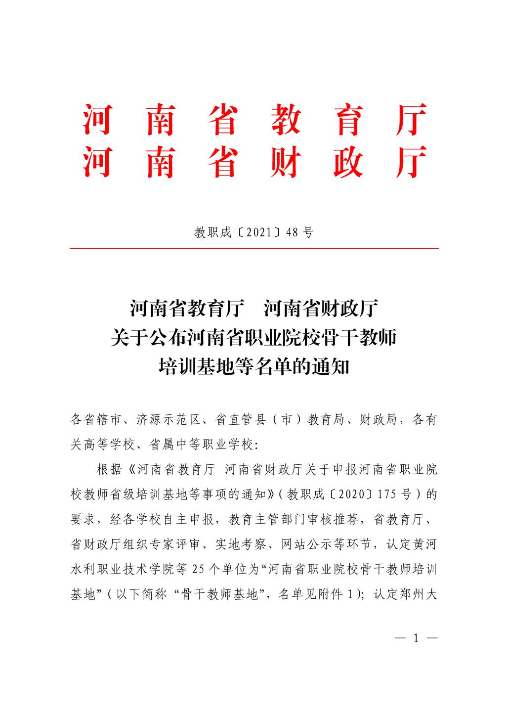 近日,河南省教育厅和河南省财政厅联合下发《关于公布河南省职业院校骨干教师培训基地等名单的通知》(教职成〔2021〕48号),我校荣获“河南省骨干教师培训基地”“河南省职业院校‘双师型’教师培养培训基地”“河南省职业院校‘双师型’名师工作室”“河南省职业院校教师技艺技能传承创新平台”四项荣誉称号。