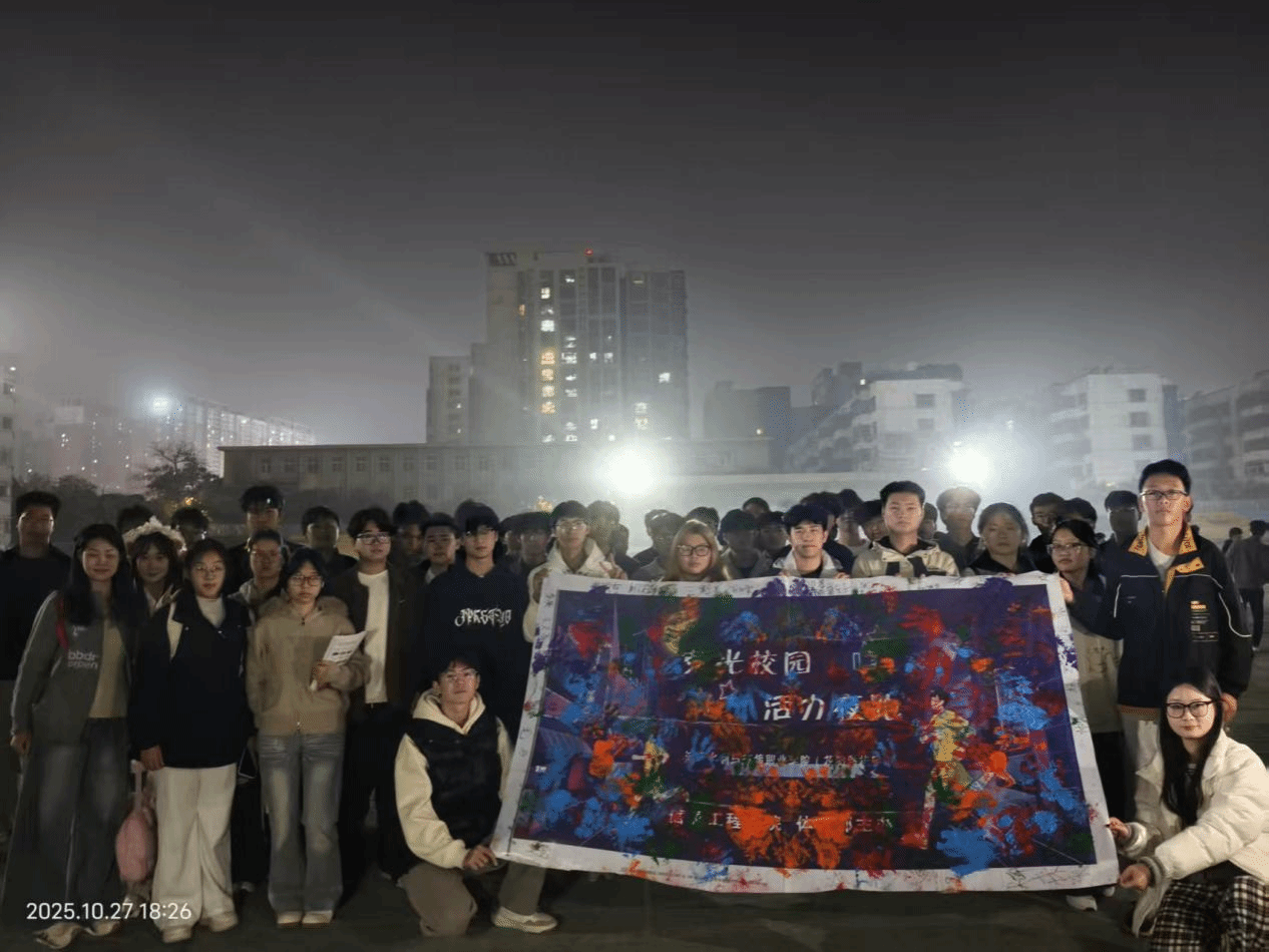 在现场,同学们用荧光手环、荧光发箍以及荧光棒精心装扮,瞬间化身“发光体”。动感音乐中,整片操场汇成璀璨银河。一声令下,闪耀的人潮如流动的霓虹,欢乐开跑。涌动的人群、闪烁的荧光与昂扬的欢笑,共同织就了校园里最酷炫的风景线。参与人员跑完之后纷纷在海报上印手印留念,这是青春鲜活的注脚,也是我们共赴的热忱。